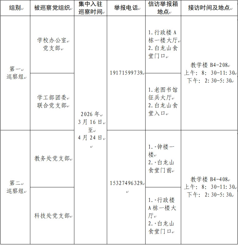 荆楚理工学院一届党委第六轮巡察进驻情况一览表